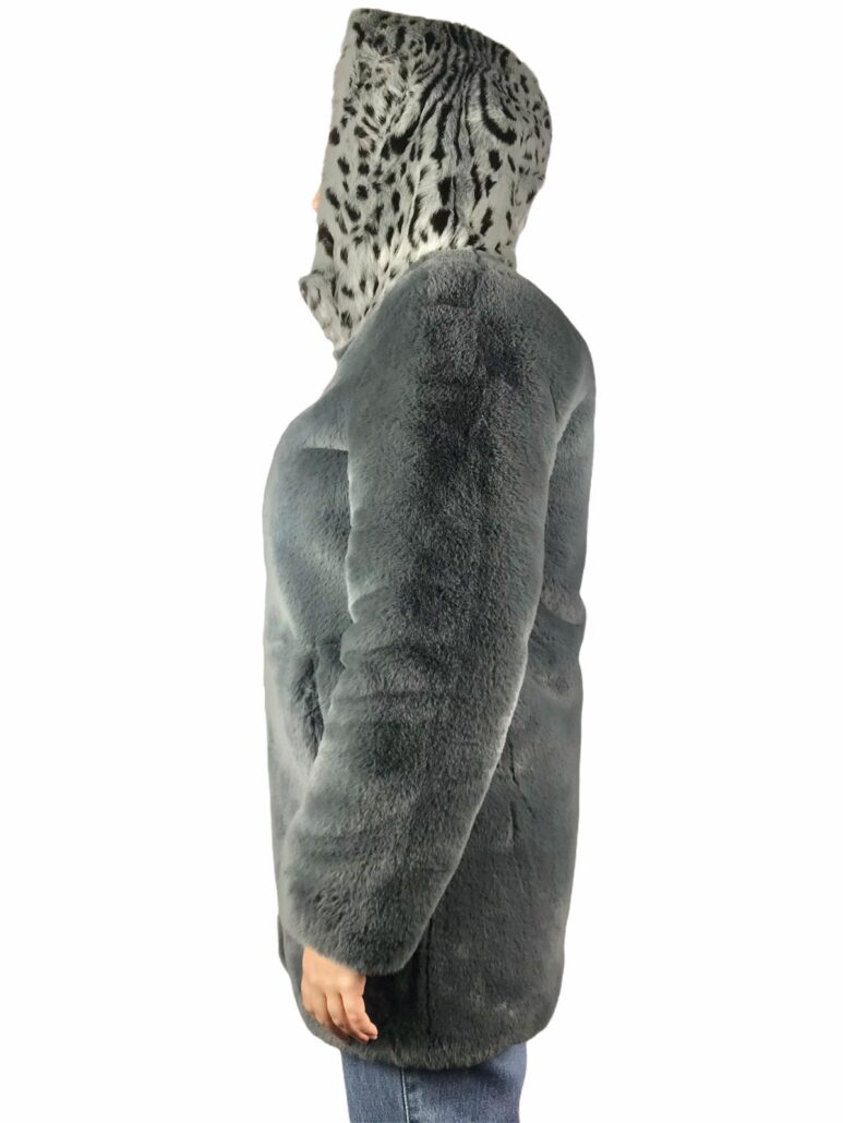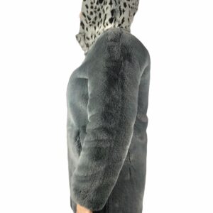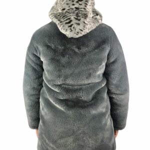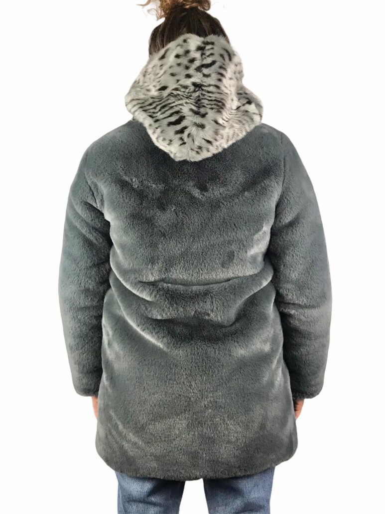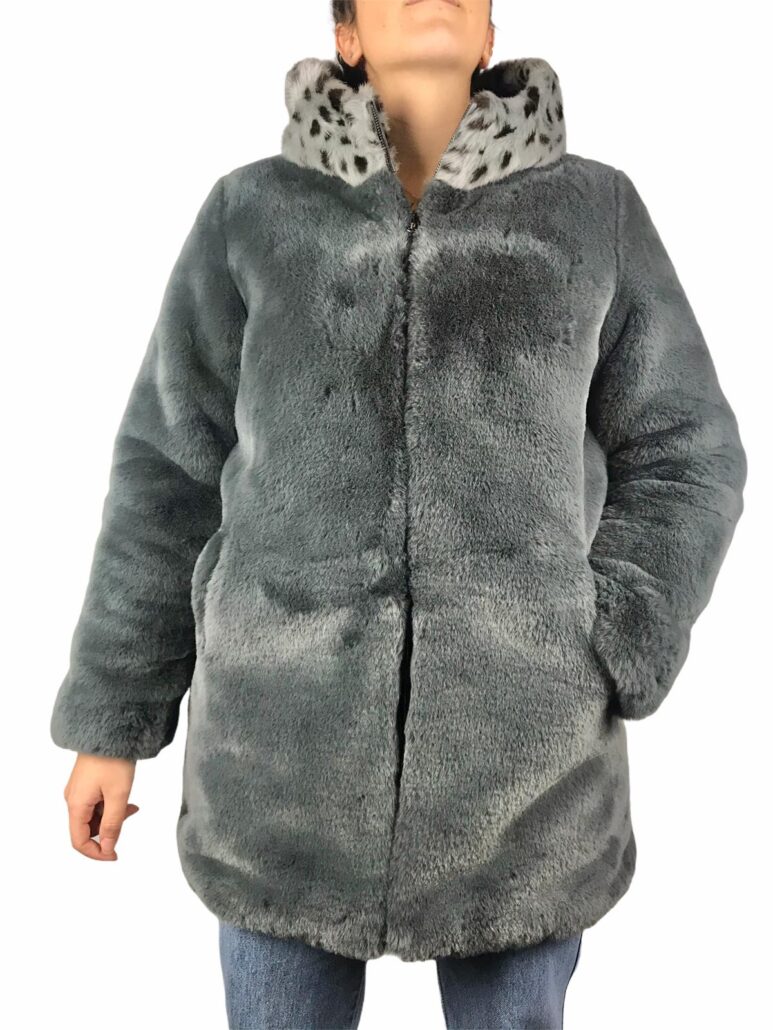 morbido giaccone realizzato in ecopelliccia ,cappuccio ,zip collo alto regolabile, grigio chiaro