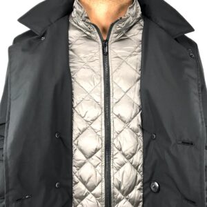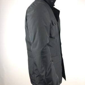 tessuto tecnico, senza applicazioni, tinta unita, doppiopetto, bottoni, collo alto, multitasche, maniche lunghe, interno in piuma d’anatra, contiene parti non tessili di origine animale, modello sahariana