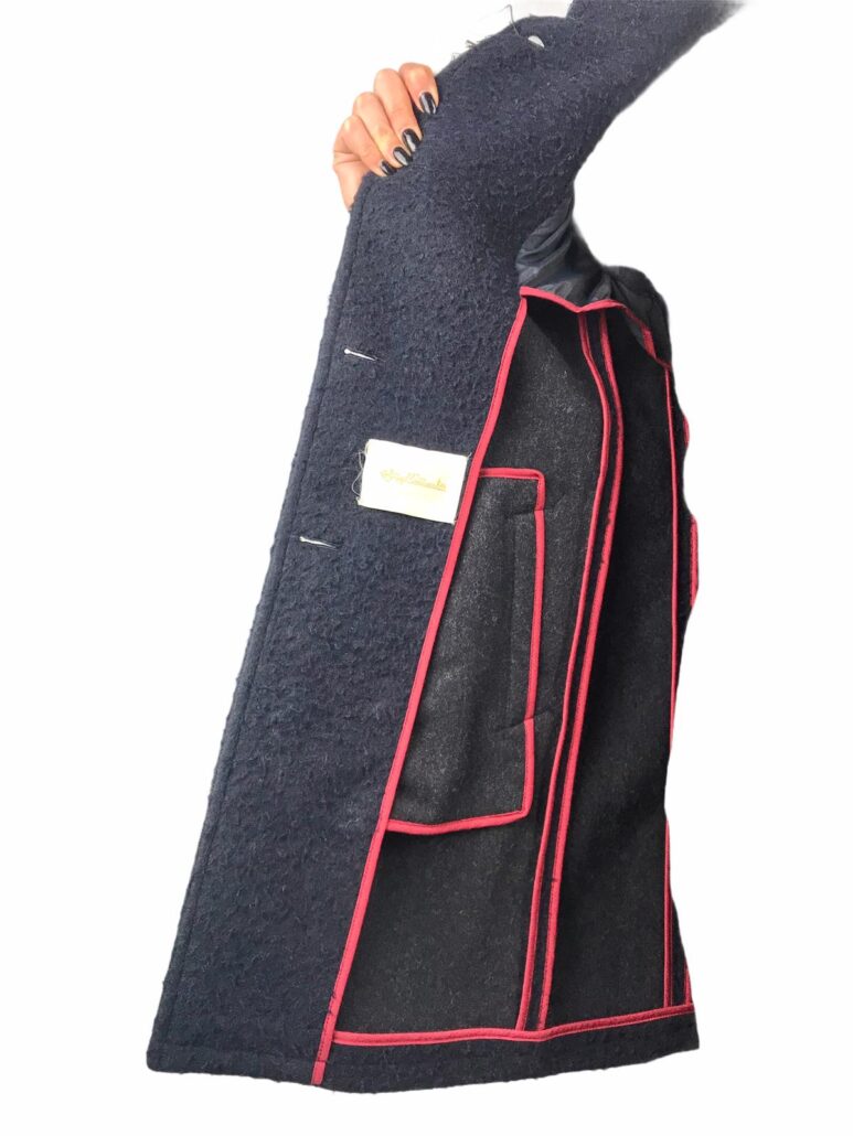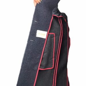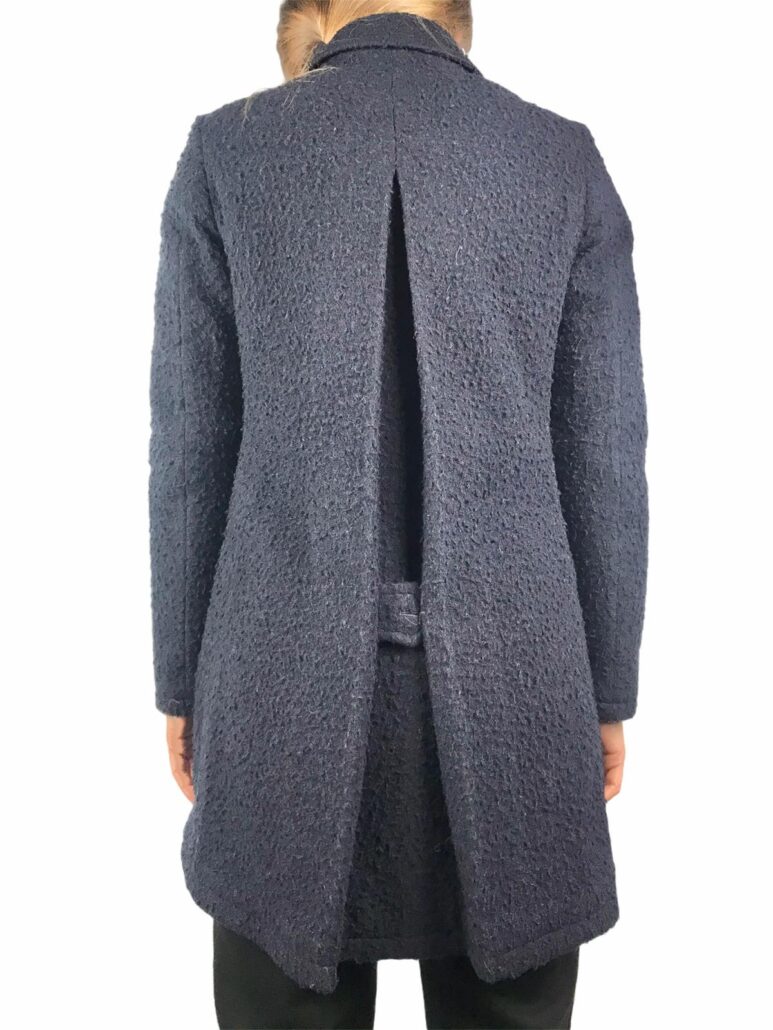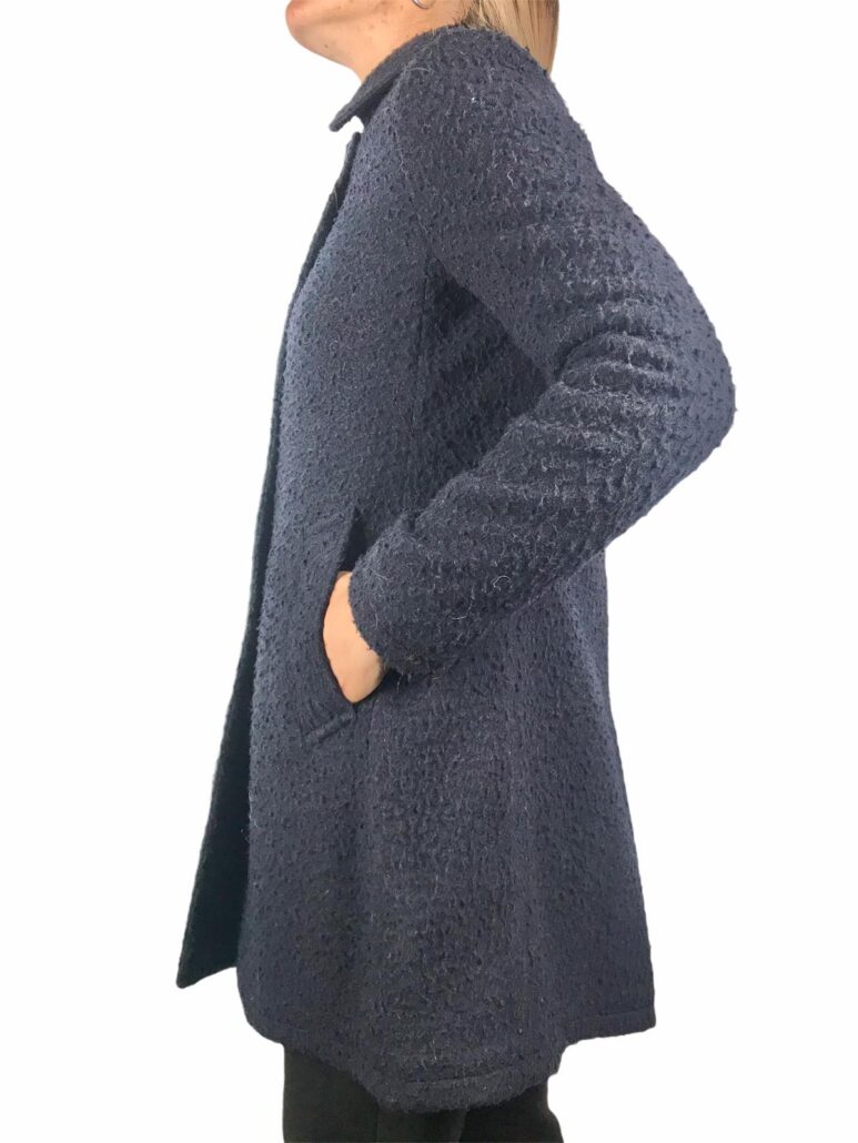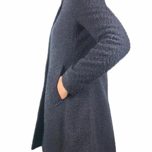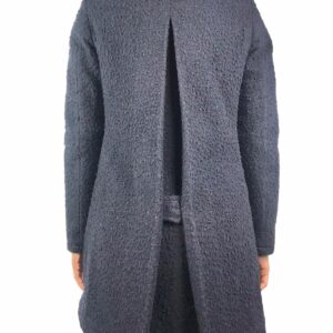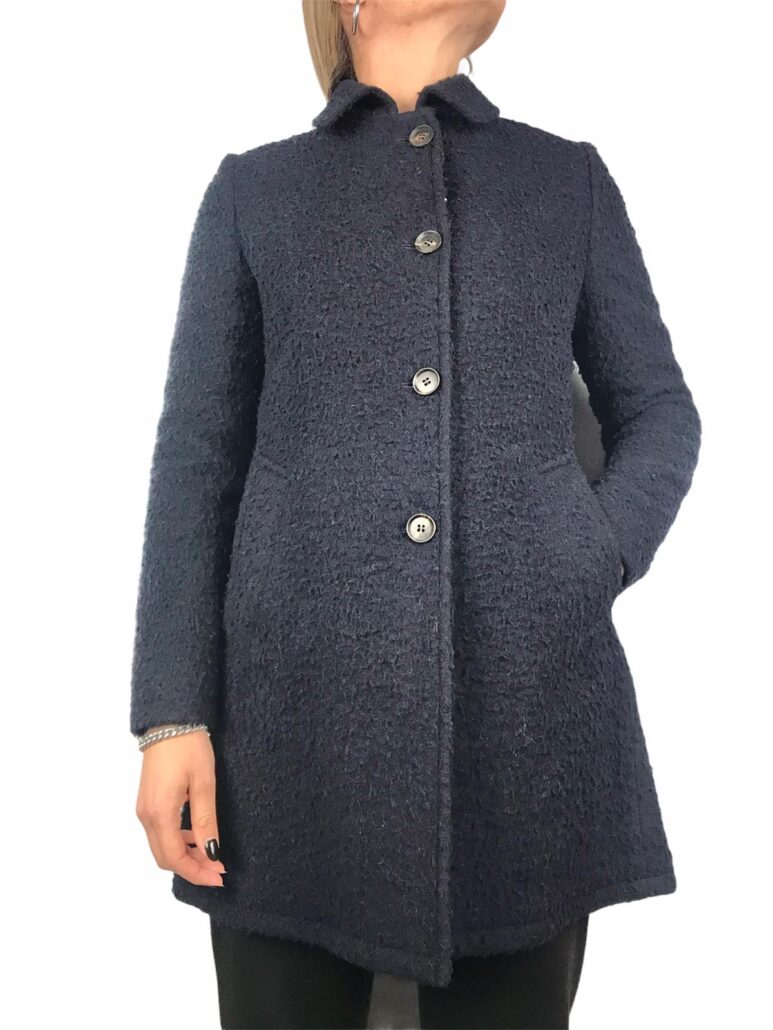 elegante cappotto realizzato in lana effetto bouclè ,color blù ,colletto ,tasche laterali martingala sul retro