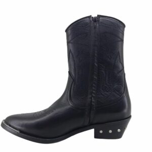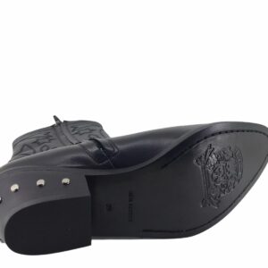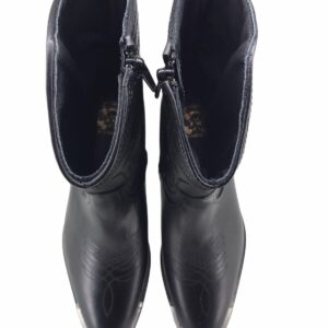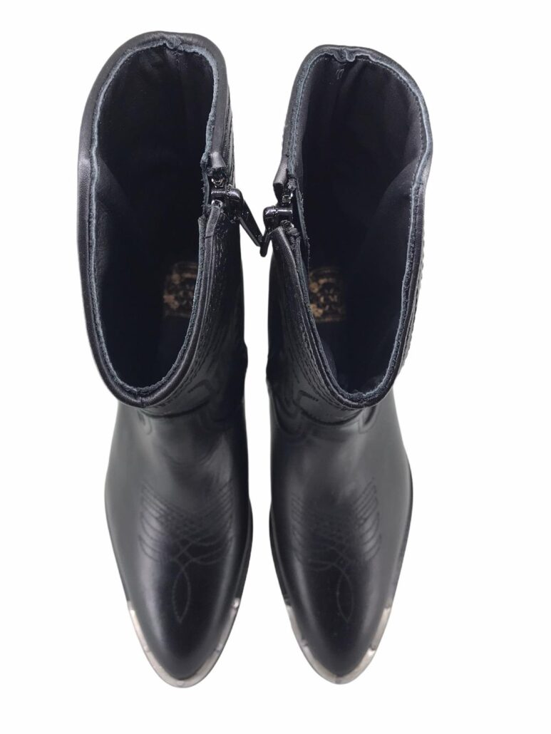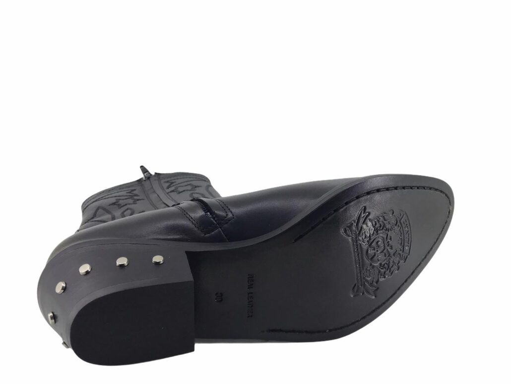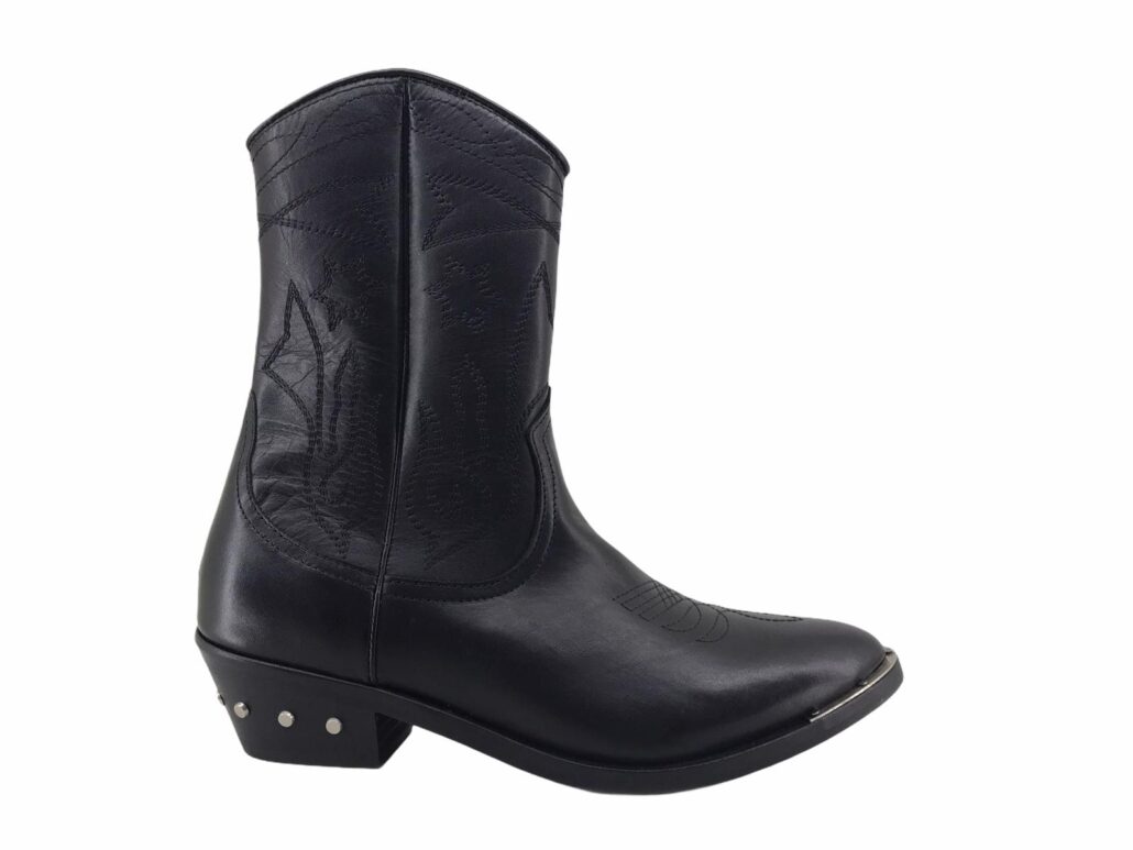 stivale western altezza media,realizzato in vera pelle,suola in cuoio con lavorazioni antiscivolo,applicazione metallica in punta ,tacco in legno con applicazioni metalliche,punta a V