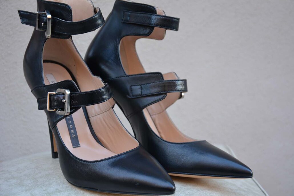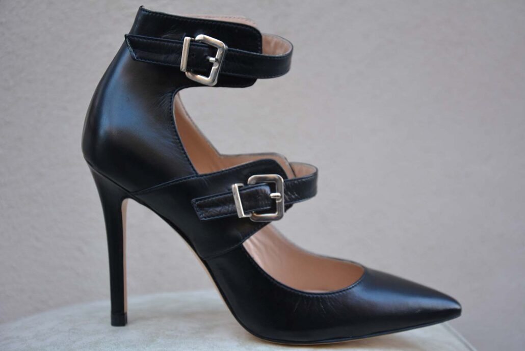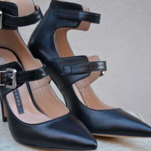 PELLE 100%, NERA, TACCO SOTTILE, SCARPA EQUILIBRATA, DOPPIA FIBBIA