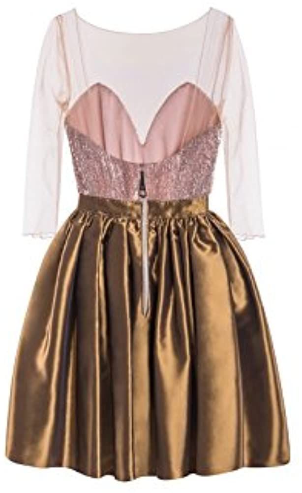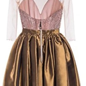 abito elegante dorato , realizzato in tulle di poliestere e fibre , coppa interna al seno , zip sul retro per facilitare la vestibilità , elegante e frizzante allo stesso tempo