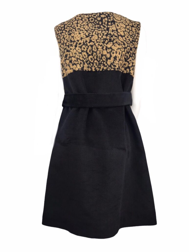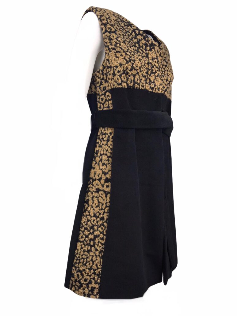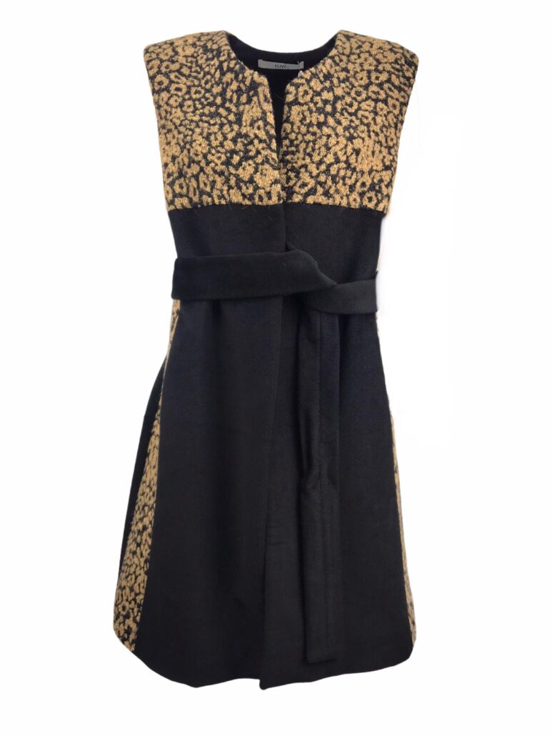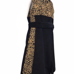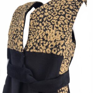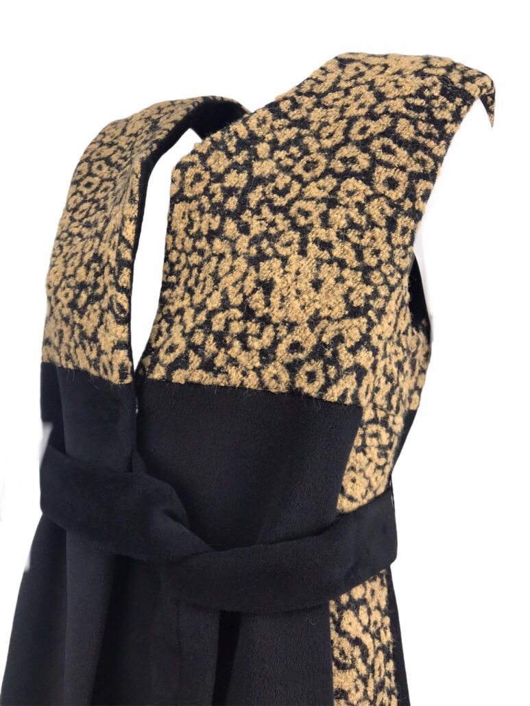 cappotto smanicato realizzato interamente in lana ,strutturato,lavorazione in bouclè nella parte color cammello,fascia avvolgente per chiudere il cappotto