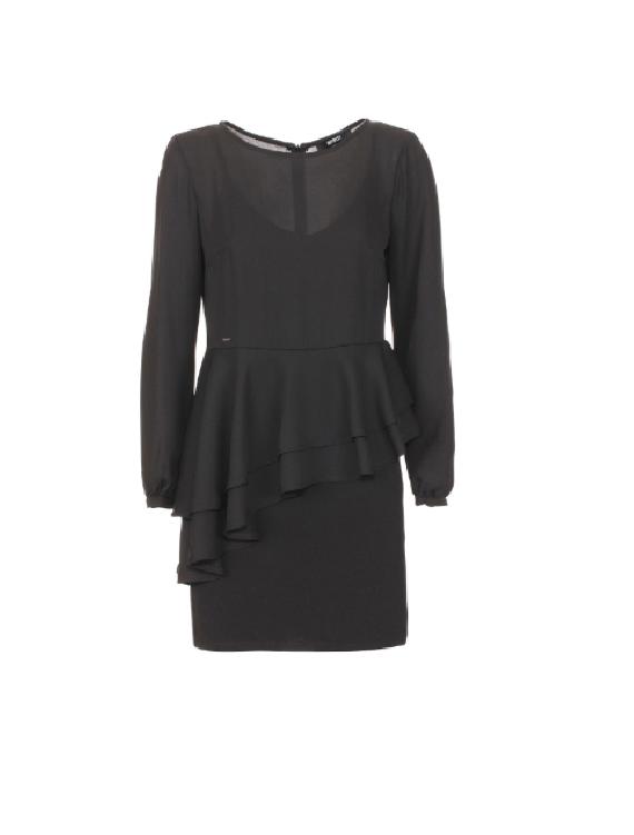 abito nero con trame organzate , poliestere , linea morbida , maniche lunghe