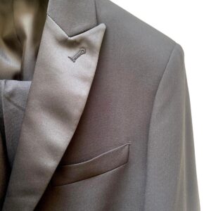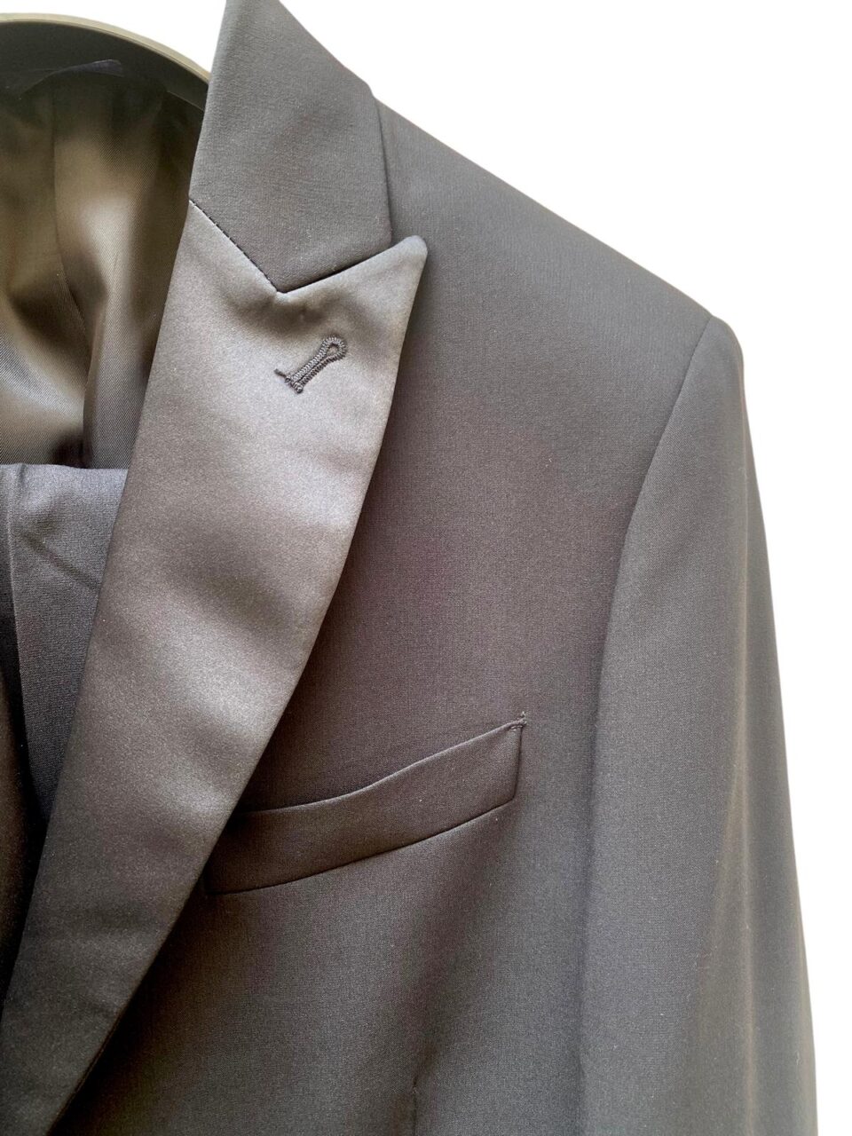 la giacca con revers in raso e il pantalone dal fit asciutto utilizzabile ber le cerimonie o le occasioni piu formali,