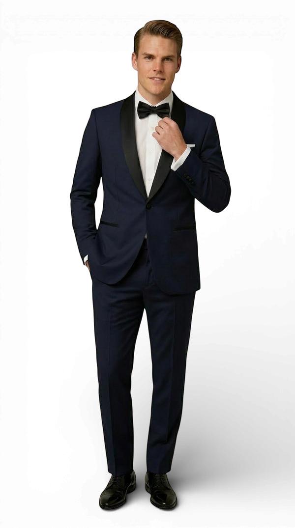 la giacca con revers in raso e il pantalone dal fit asciutto utilizzabile ber le cerimonie o le occasioni piu formali,