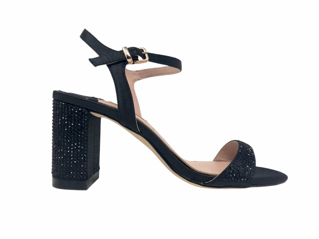 scarpa in similpelle foderata in raso e applicazioni in strass in tinta , tacco 7 cm , chiusura con fibbia