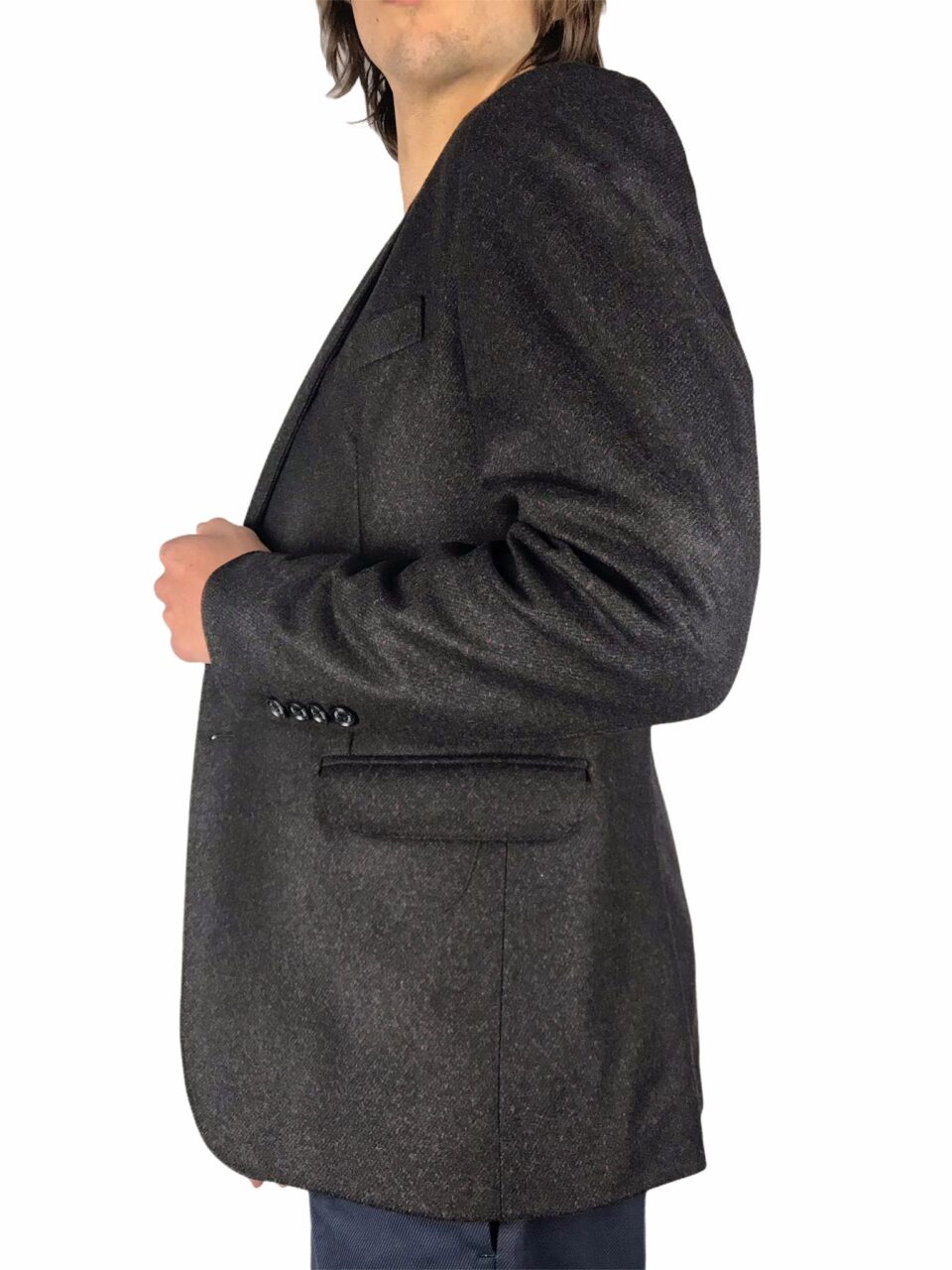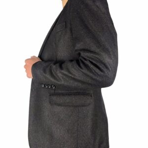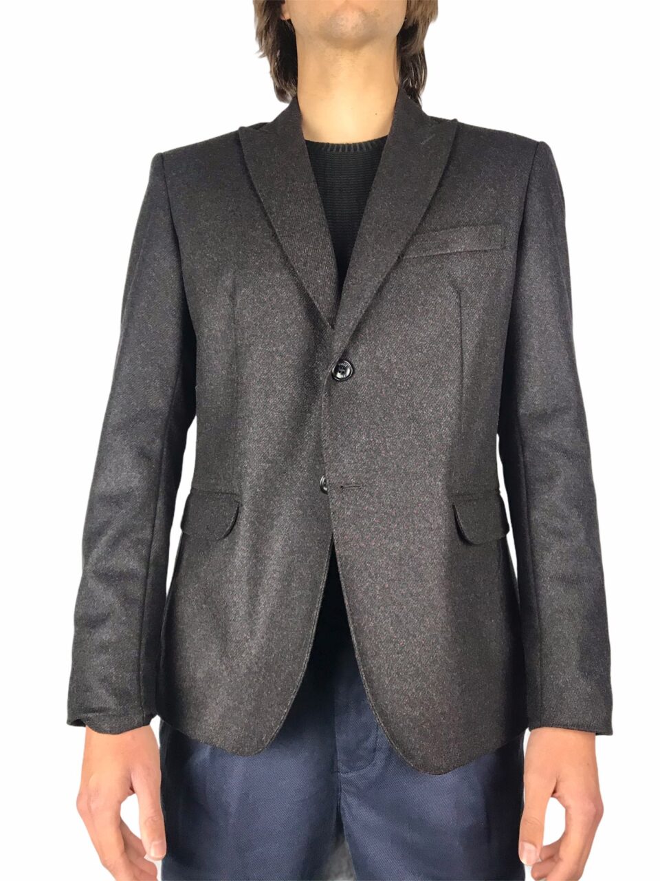 giacca uomo dal fit giovane ,base marrone terra bruciata con micro fantasia rossa in tessuto ,realizzata in lana e fibre ,interno con tasca porta oggetti