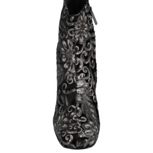 Velluto, lamè, paillettes, fantasia floreale, zip, punta tonda, tacco squadrato, interno in pelle, suola di gomma, contiene parti non tessili di origine animale