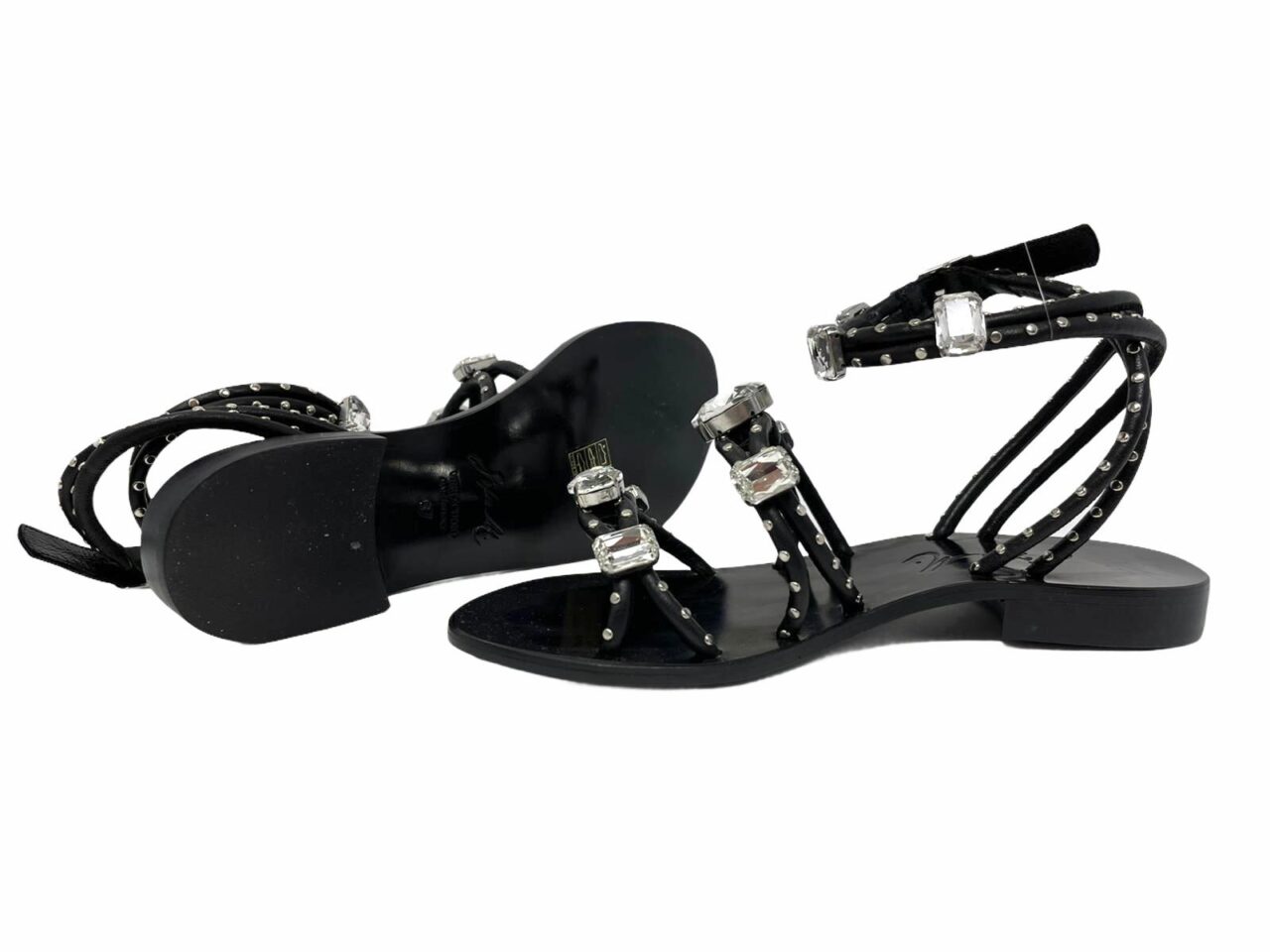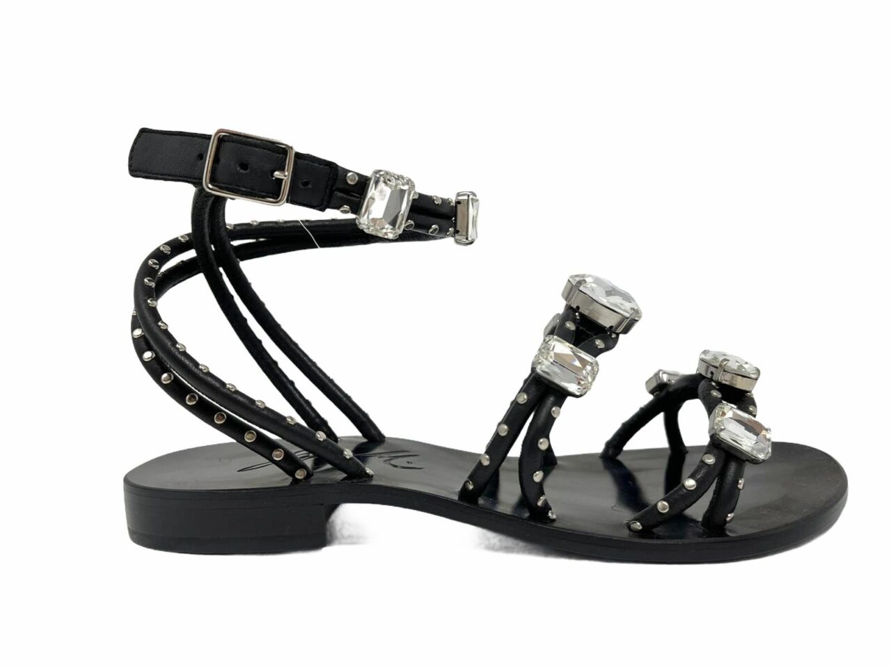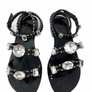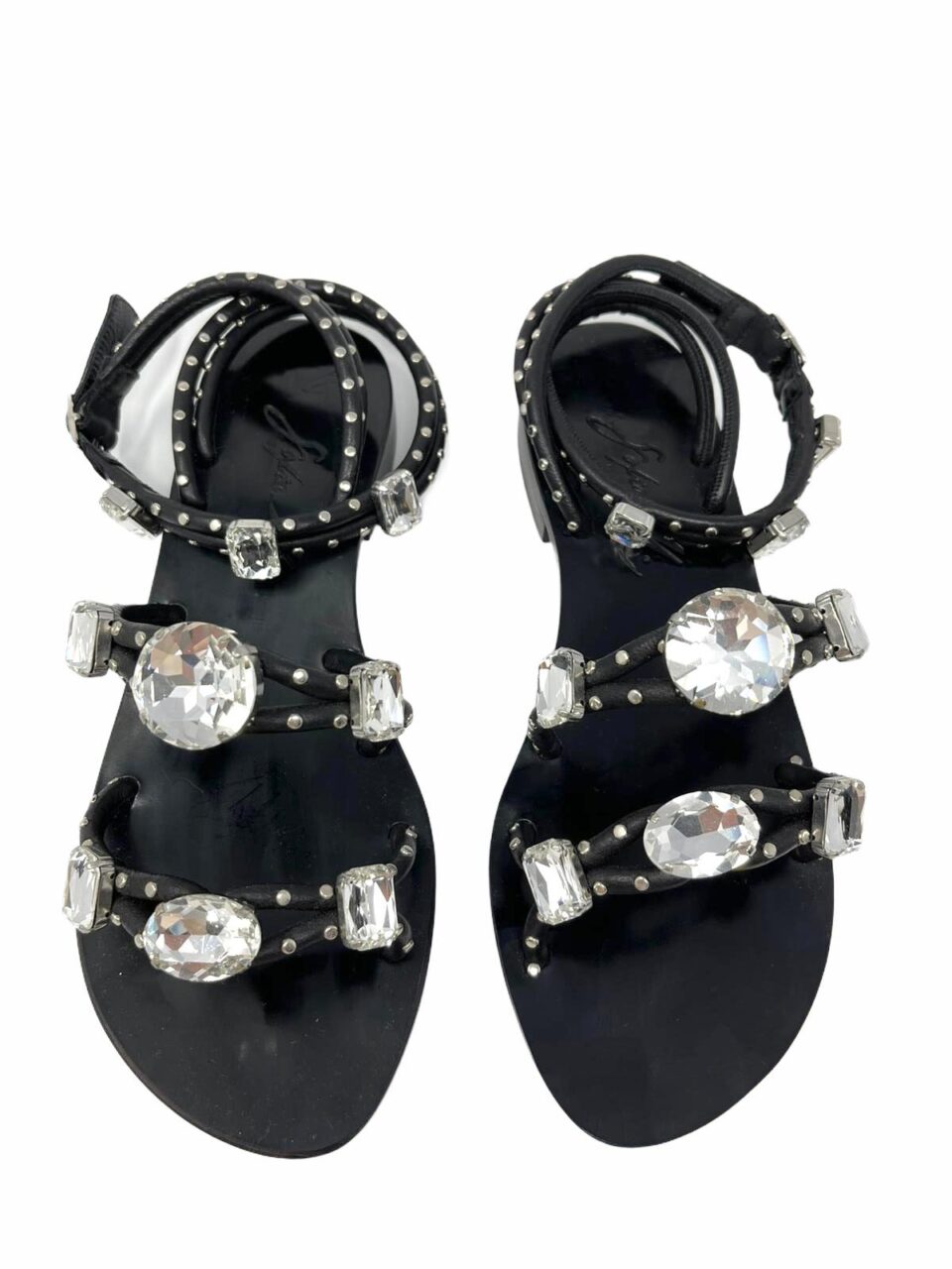 sandalo gioiello realizzato in vera pelle , cinturini in pelle con applicazioni metalliche , pietre strass , suola in cuoio, tacco 2,5 cm
