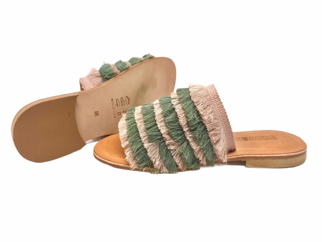 fascia in cuoio , frange in raso bicolore , suola in cuoio con lavorazioni antiscivolo , tacco 1,5 cm