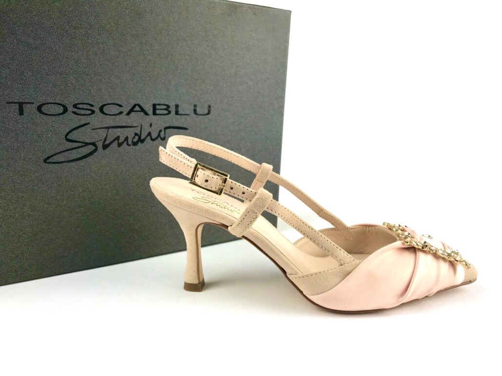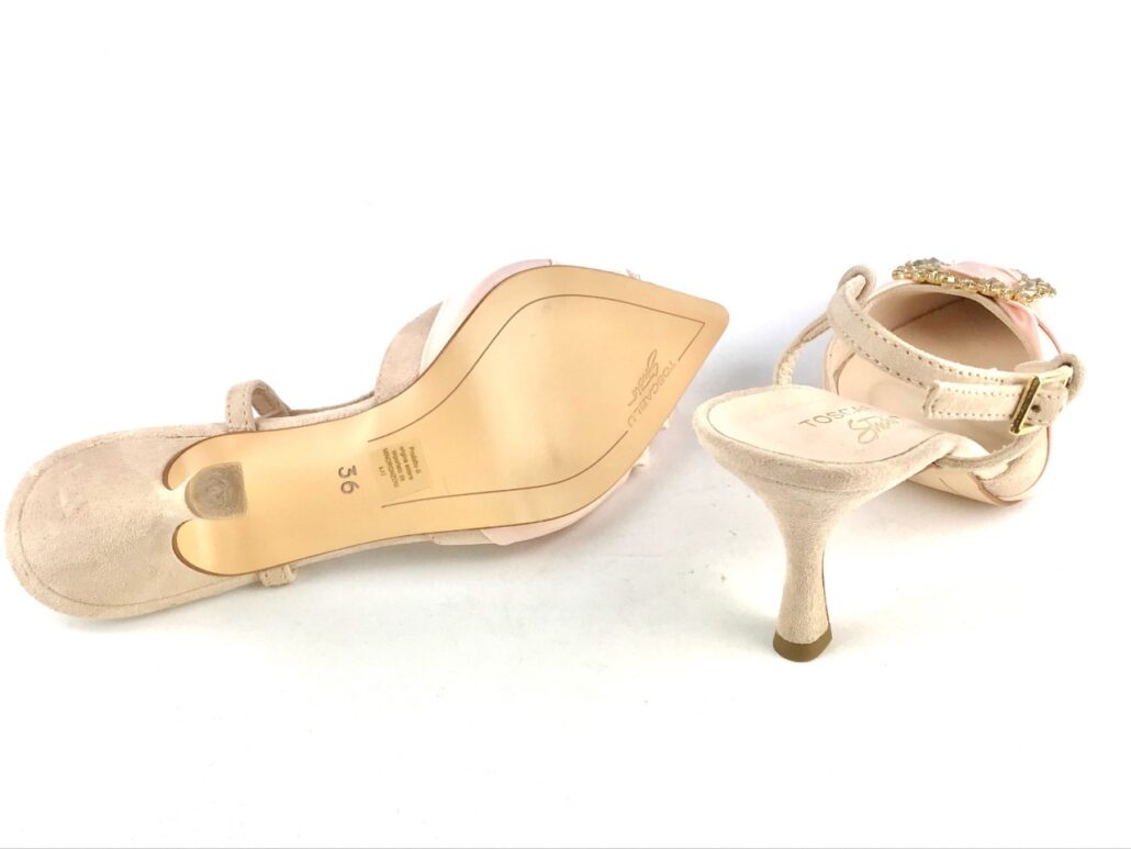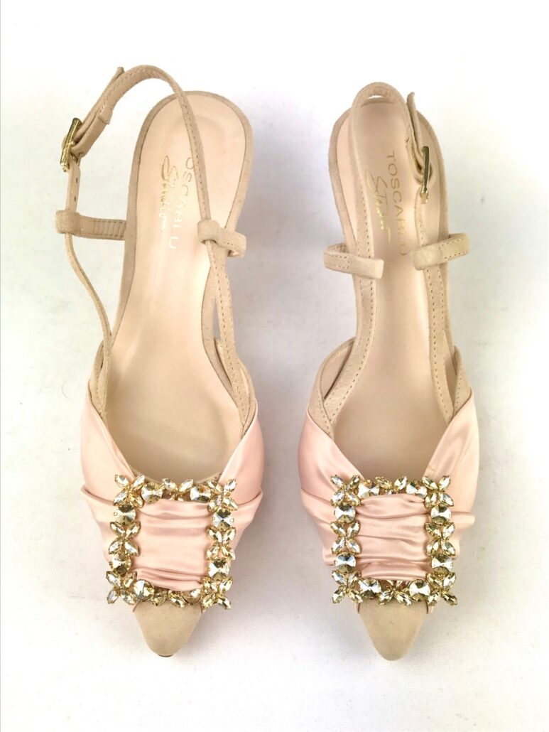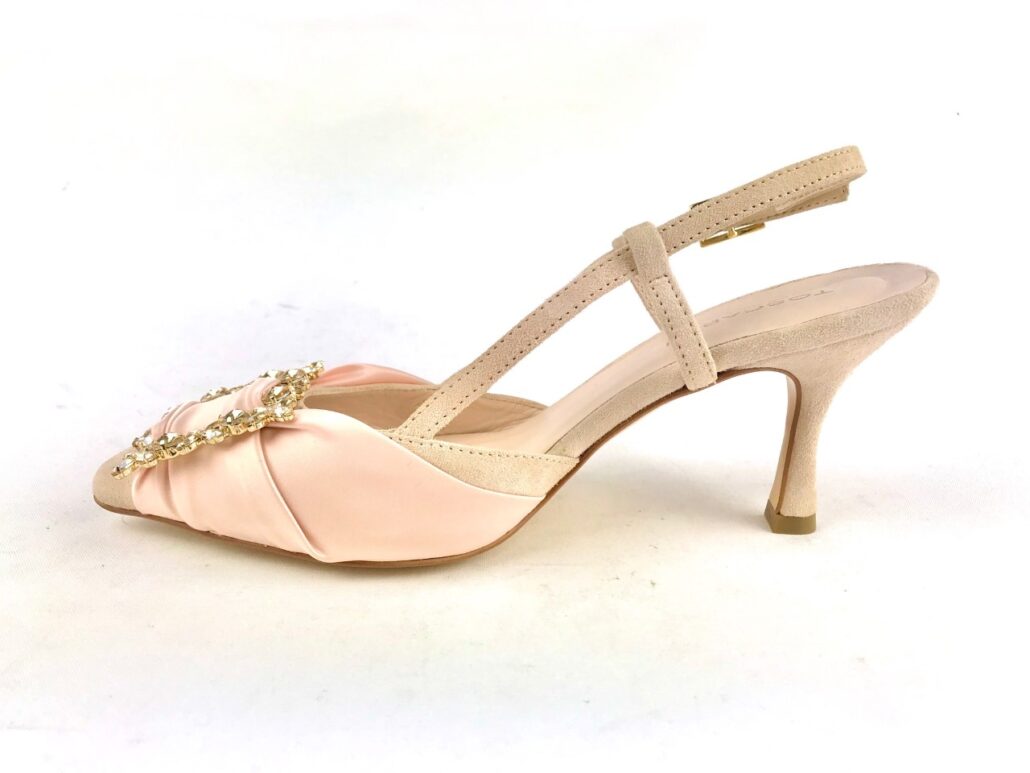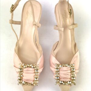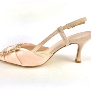 scarpa realizzata in pelle , con fascia di raso cipria , applicazione gioiello , tacco 7 cm