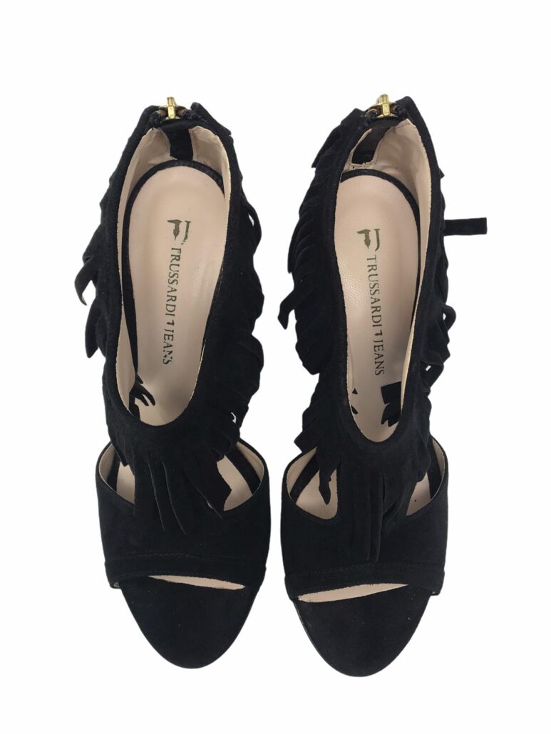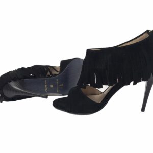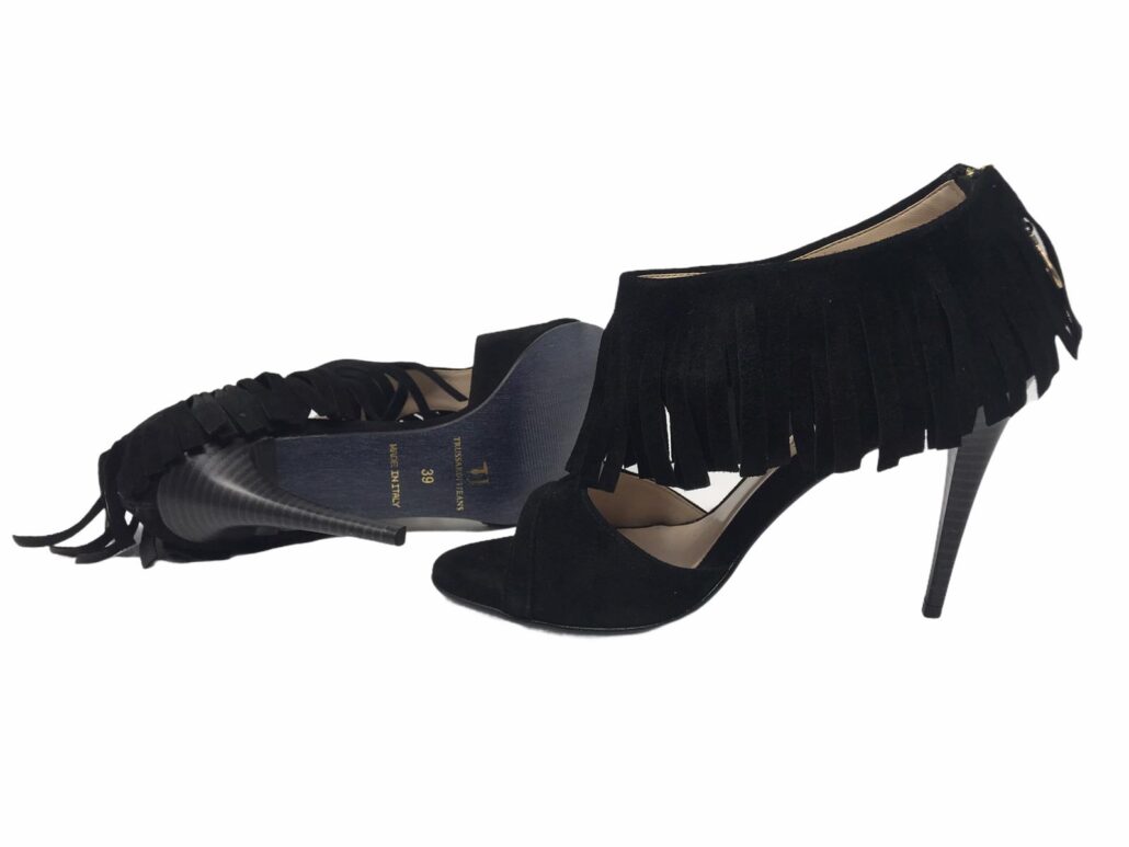 sandalo donna con frange e tomaia in vera pelle , tacco 100 mm , suola in cuoio con lavorazioni antiscivolo cerniera posteriore per facilitare la calzata