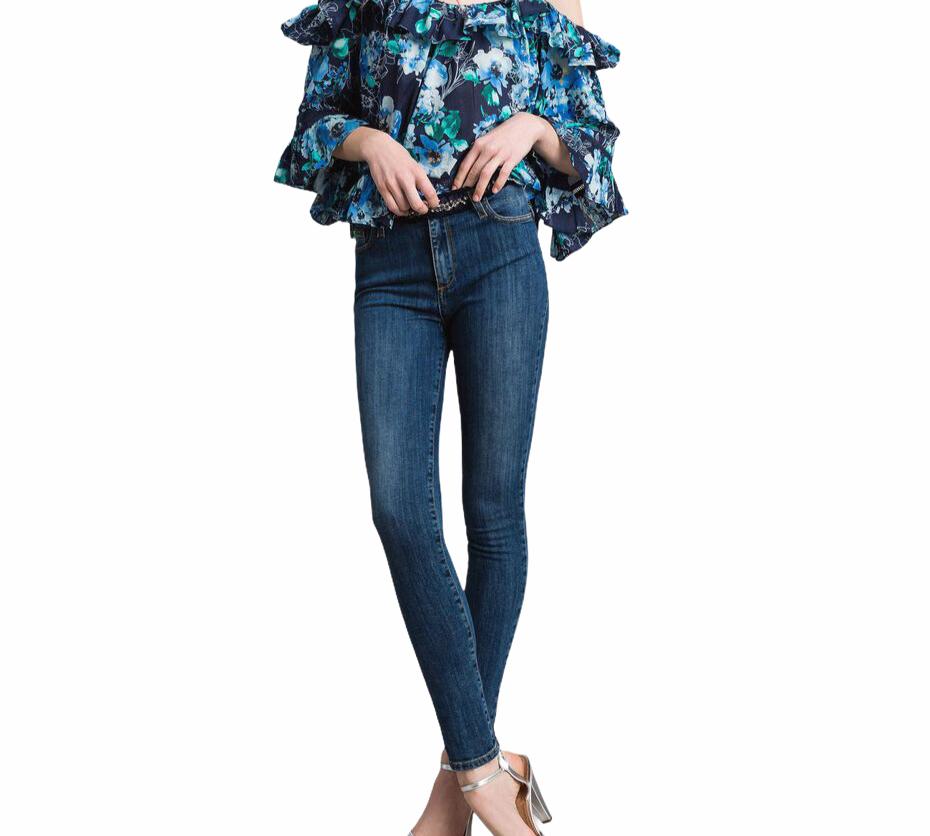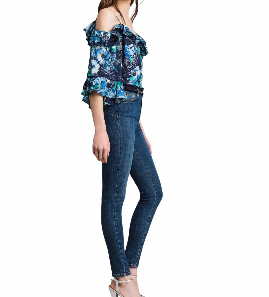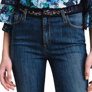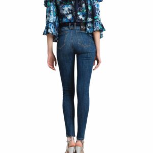 denim cotone elasticizzato con lavorazione arricciato tessuto raso e pietre in vita , vestibilità skinny