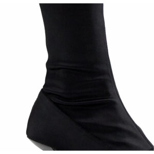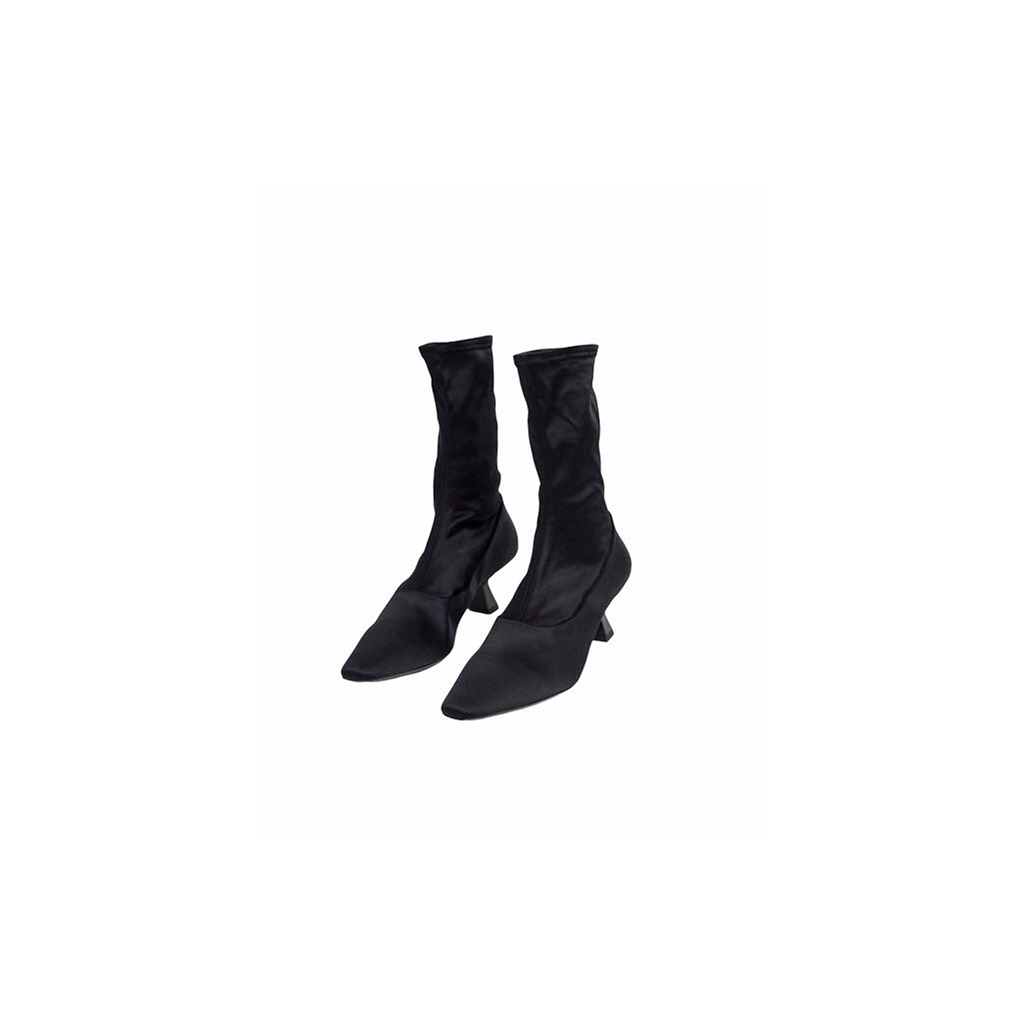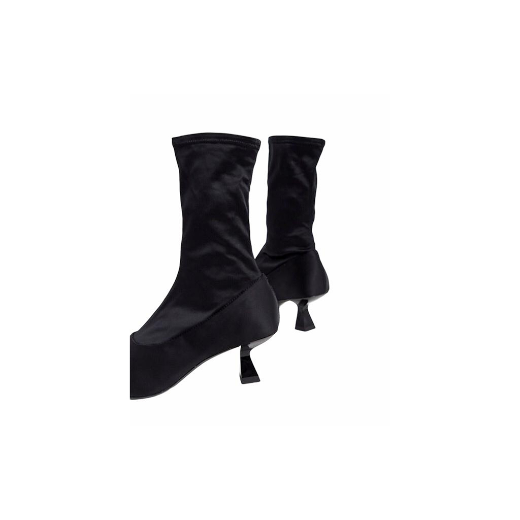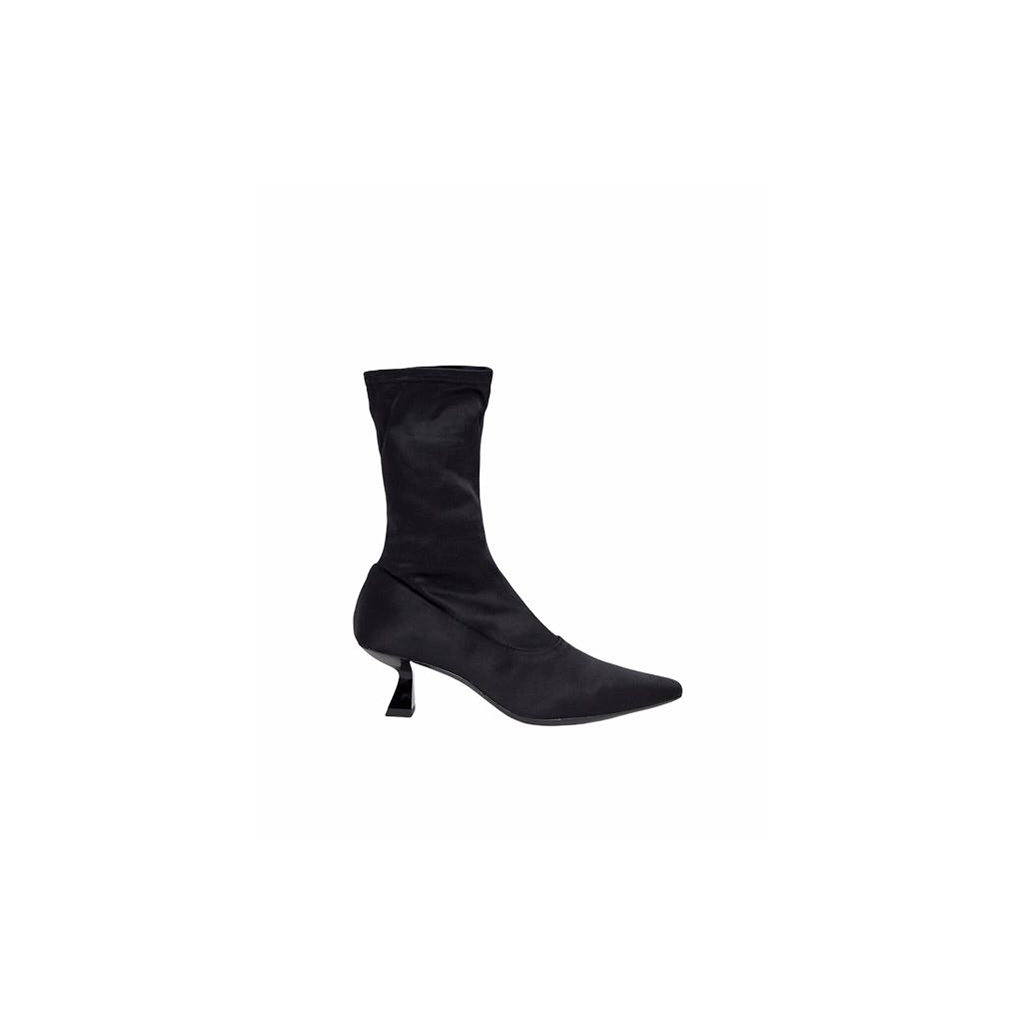 realizzata in tessuto elasticizzato,tacco basso 3.5 cm,punta affusolata ,altezza del gambale sopra la caviglia