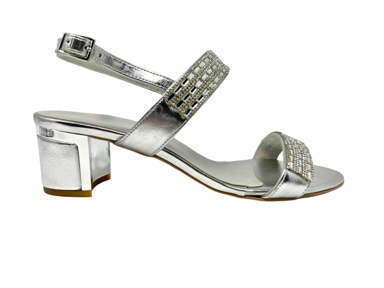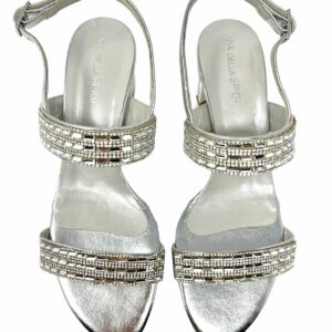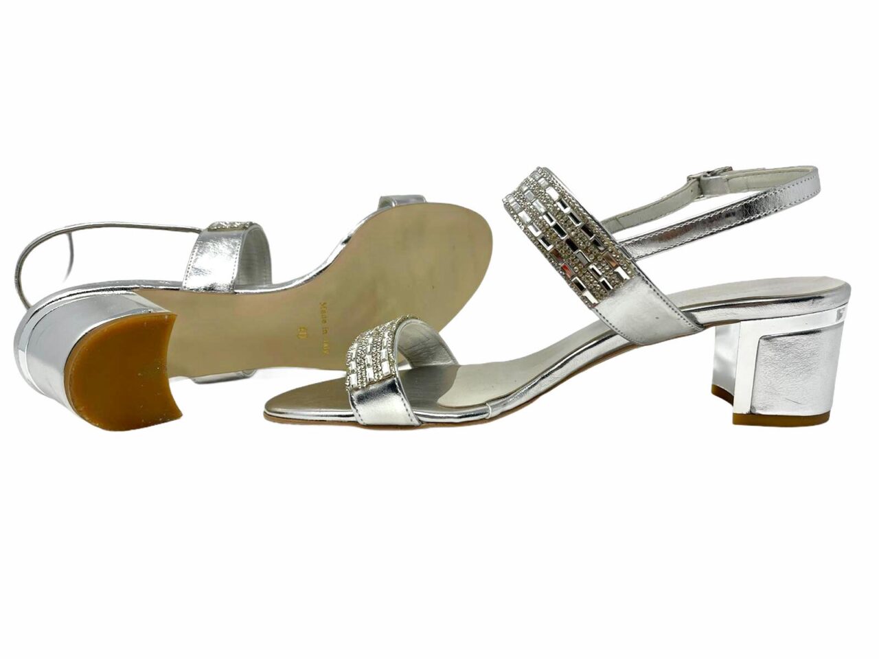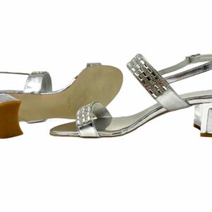 scarpa argentata realizzata in pelle , suola in cuoio , plantare in pelle , applicazione di strass silver sulla tomaia , scarpa elegante e comoda