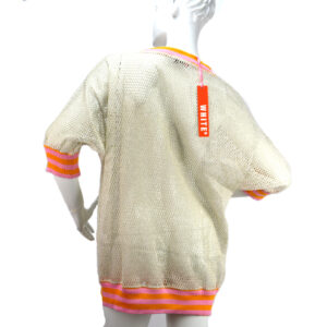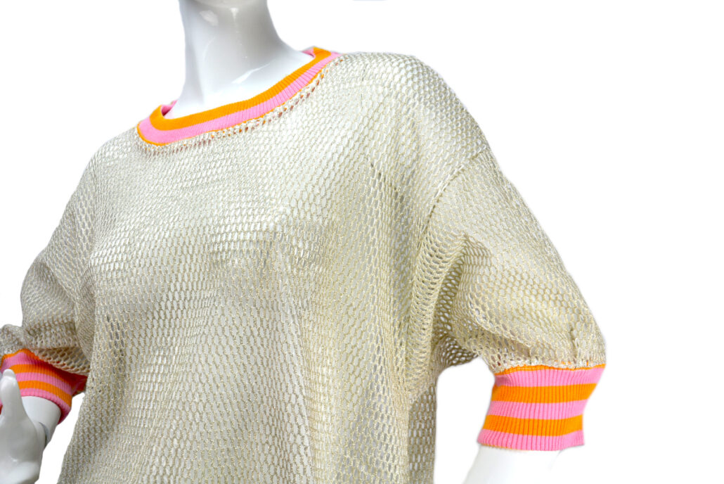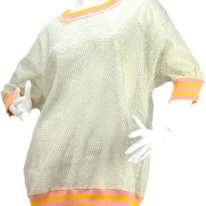 YLENIA WHITE silver lurex mesh shirt mesh sweater in silver lurex fabric, two-tone elastic (pink / yellow) on sleeves and waist, 3/4 sleeves, perforated and unlined, usable with a lace top or a tank top or shirt to highlight the net (ONE SIZE )